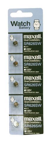 | 9 of 9 people found the following review helpful Jru (Wisconsin) - See all my reviews Amazon Verified Purchase This review is from: Maxell Watch Battery Button Cell SR626SW SR-626SW 377 Pack of 5 Batteries (Electronics) This 5 pack was $1 more than getting a single battery. I recommend getting the 5 pack instead of only 1 because you know you will need another one sooner or later.Also, this is a popular watch battery size so you will find more uses for them than you thought. They were the same battery that I needed in 3 of my watches and one of my girlfriend's watches too. I shopped around and this was the best deal on this model watch battery while still buying less than 10. 5 of 5 people found the following review helpful Amazon Verified Purchase This review is from: Maxell Watch Battery Button Cell SR626SW SR-626SW 377 Pack of 5 Batteries (Electronics) A good way to buy, always have a spare and last as long as other batteries 3 of 3 people found the following review helpful bargainshopper - See all my reviews Amazon Verified Purchase This review is from: Maxell Watch Battery Button Cell SR626SW SR-626SW 377 Pack of 5 Batteries (Electronics) This was a great deal and a great price, you can't beat this deal anywhere else, I know, I have looked!!! |